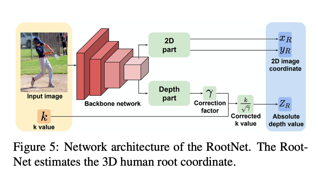 위에까지가 이 포스트의 주요 관심사이고, 그렇다면 training때와 inference 때 k의 각 구성 요소인 alpha x, alpha y, Areal, and Aimg는 어떻게 구할까. alpha x,y는 training 때 데이터셋의 카메라 intrisic parameter로부터 구할 수 있고, inference 때는 임의로 설정할 수 있다. 즉 inference 때는 미리 정한 (camera normalized) focal length에 대한 initial depth approximation k를 임의로 설정한다. Aimg는 training, inference 상관없이 input의 bounding box로부터 얻을 수 있고, Areal은 2000mm*2000mm로 고정한다. Areal 값을 고정하는 로직은, 피사체를 항상 사람으로 가정하기 때문에 평균적인 사람의 크기를 가져다 쓴다는 개념이다. 당연히 이렇게 고정된(constant) Areal값으로부터 나온 k는 에러가 있을 수 밖에 없는데, 바로 Areal이 고정된 값이라는 것에 대한 에러를 correction하는 값(r=gamma)을 learning하는게 바로 RootNet의 목적이다. Areal에 대한 correction factor를 learning할 수 있는 이유는 image feature로부터 그런 정보를 얻을 수 있다는 가정 때문이다. 예를 들어 두 피사체(사람)가 카메라로부터 같은 거리에 있더라도 pose가 다르면 Areal이 다른 데, 사람과 마찬가지로 deep learning network도 image feature를 통해 두 사람의 pose가 다르다는 것을 알 수 있다. 다른 예로 어른과 아이는 Areal이 다른 데, 이 때문에 어른이 카메라로부터 아이보다 더 멀리 있어도 면 Aimg가 더 작거나 비슷해져, 결국 아이보다 더 작거나 비슷한 depth(k)값을 가지게 되는데, deep learning network가 어른/아이 여부를 판별할 수도 있다.